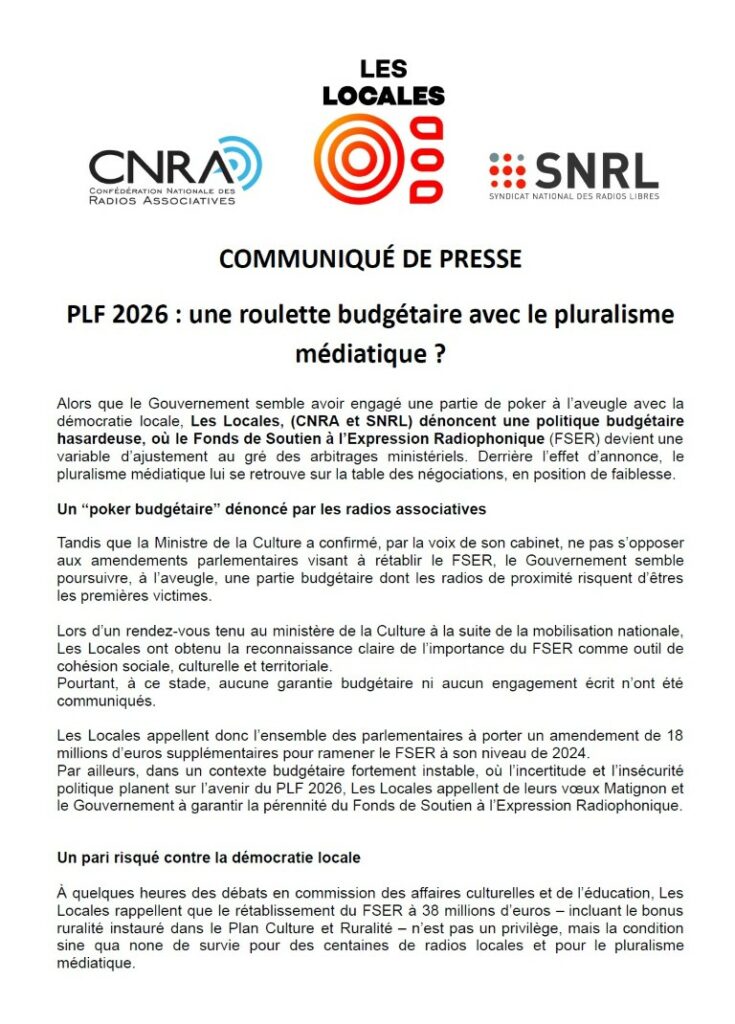 Le FSER subit -44 % dans le PLF 2026. Ce n’est pas une “économie” : c’est moins de pluralisme, moins d’information de proximité, moins de démocratie au quotidien.