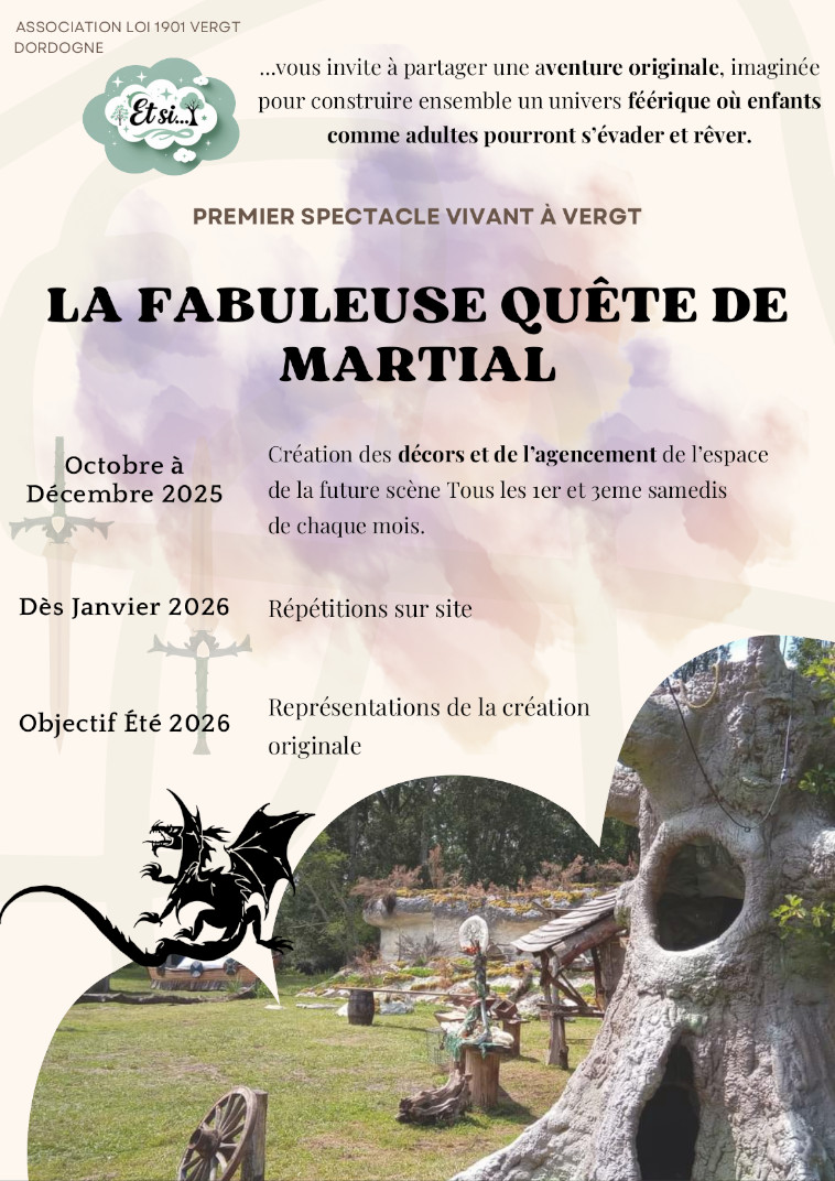 Pour l’été 2026, c’est le spectacle nommé « La fabuleuse quête de Martial » qui sort de terre pour la premier fois à Vergt. Martial, un petit garçon aventurier, laisse échapper trois lumières. Il part en quête pour récupérer les lumières avec son camarade et rencontrera notamment des pirates sur un magnifique vaisseau animé pendant le spectacle. Martial découvrira aussi d’autres univers fantastiques et de science ficition dans ce spectacle sons et lumières à faire palir les romans de cap et d’épée.