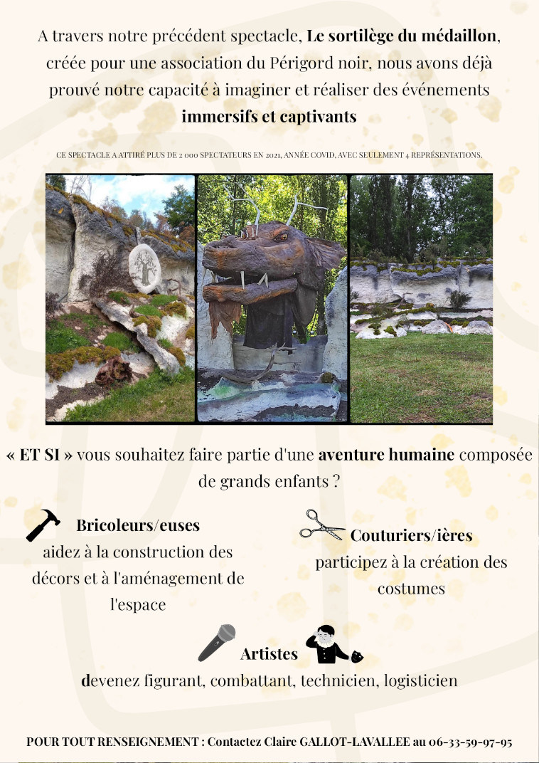 L’association vernoise Et si ? créée en 2021 par le couple Claire Gallot-Lavallée et David Choury, a fabriqué son premier décors avec le spectacle « Le sortilège du médaillon » pour les Médiévales de la Vézère. Un spectacle nocturne de 4 représentations pendant la crise sanitaire qui a attiré plus de 2000 personnes. On y découvrait un décors de façade rocheuse très ressemblante à celle de La Roque Saint-Christophe avec en supplément, la possibilité de s’ouvrir pour laisser passer la tête d’une dragon.