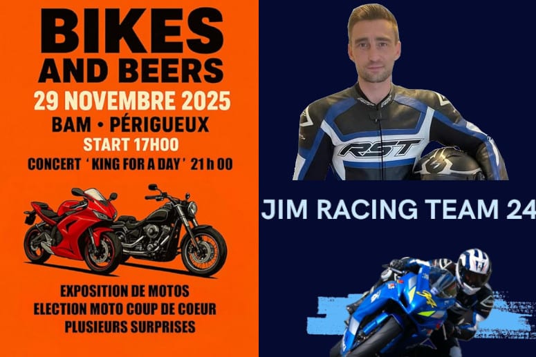 Le Samedi 29 novembre 2025 à la Brasserie la BAM à Périgueux, l’association JRTmoto24 (Jim Racing Team) créée en janvier 2025 par Jimmy Faye a préparé une soirée concert et exposition motos (vintage ou non). Trois prix seront remis. L’entrée est gratuite.