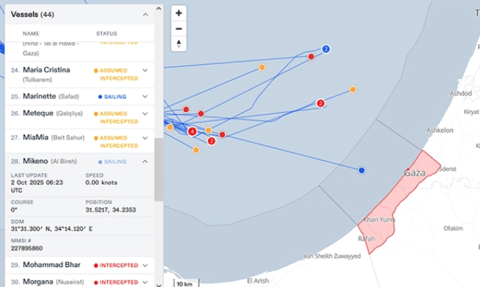 Dans la nuit du mercredi au jeudi 2 octobre, les bateaux humanitaires de la flotille Soumoud ont été arrêtés illégalement par Israël à environ 200 kilomètres au large de Gaza.
