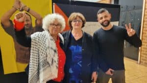 Photo : Noha Rashmawi, Violette Folgado, Sharaf Barghouti avant la rencontre à Boulazac l’Isle Manoire