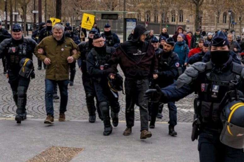 Photo de la confédération paysanne des porte-parole nationaux de la confédération paysanne arrêtés devant l’Arc de triomphe le 9 janvier.