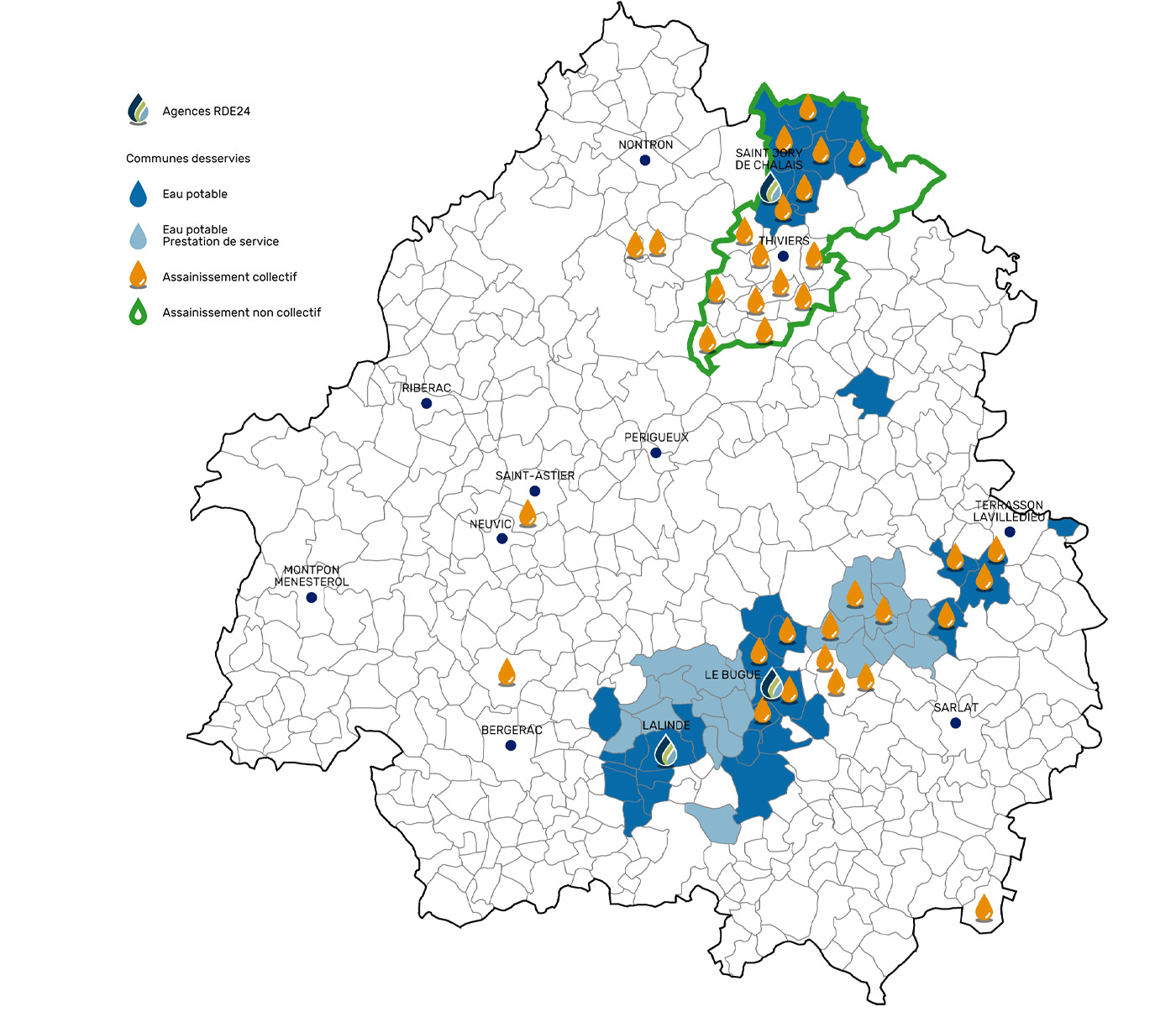 Carte des territoires de Dordgone avec la RDE24 (Régie Des Eaux de Dordogne) :