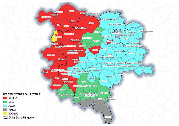 Carte des délégataires ou prestataires de l’eau potable du Grand Périgueux :